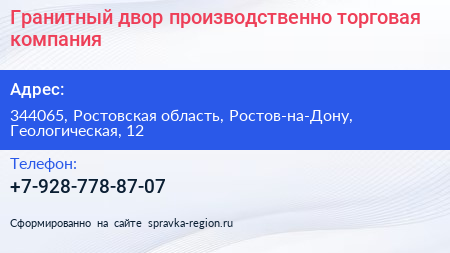 Гранитный двор, производственно-торговая компания по адресу 344065, Ростовская область, Ростов-на-Дону, Геологическая, 12 в дальнейшем Организация, размещена в следующих категориях:
