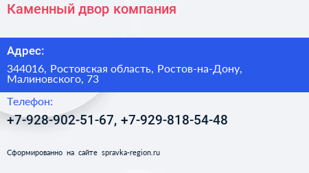 Каменный двор, компания по адресу 344016, Ростовская область, Ростов-на-Дону, Малиновского, 73 в дальнейшем Организация, размещена в следующих категориях: