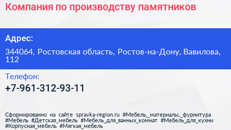 Компания по производству памятников по адресу 344064, Ростовская область, Ростов-на-Дону, Вавилова, 112 в дальнейшем Организация, размещена в следующих категориях: