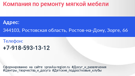 Компания по ремонту мягкой мебели по адресу 344103, Ростовская область, Ростов-на-Дону, Зорге, 66 в дальнейшем Организация, размещена в следующих категориях: