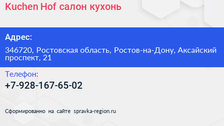 Kuchen Hof, салон кухонь по адресу 346720, Ростовская область, Ростов-на-Дону, Аксайский проспект, 21 в дальнейшем Организация, размещена в следующих категориях: