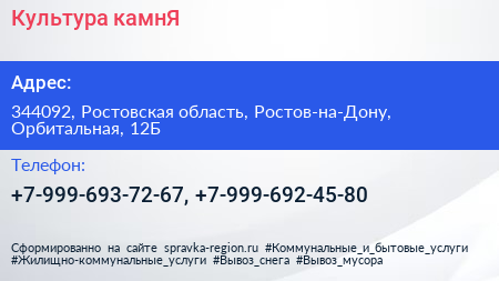 Культура камнЯ по адресу 344092, Ростовская область, Ростов-на-Дону, Орбитальная, 12Б в дальнейшем Организация, размещена в следующих категориях: