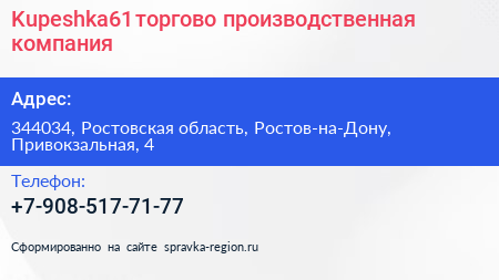 Kupeshka61, торгово-производственная компания по адресу 344034, Ростовская область, Ростов-на-Дону, Привокзальная, 4 в дальнейшем Организация, размещена в следующих категориях: