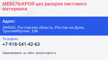 МЕБЕЛЬКРОЙ, цех раскроя листового материала по адресу 344065, Ростовская область, Ростов-на-Дону, Троллейбусная, 16Б в дальнейшем Организация, размещена в следующих категориях:
