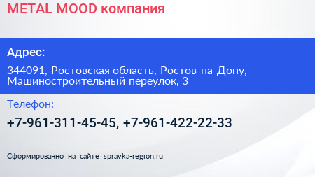 METAL MOOD, компания по адресу 344091, Ростовская область, Ростов-на-Дону, Машиностроительный переулок, 3 в дальнейшем Организация, размещена в следующих категориях: