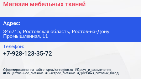 Магазин мебельных тканей по адресу 346715, Ростовская область, Ростов-на-Дону, Промышленная, 11 в дальнейшем Организация, размещена в следующих категориях: