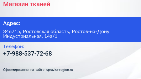 Магазин тканей по адресу 346715, Ростовская область, Ростов-на-Дону, Индустриальная, 14а/1 в дальнейшем Организация, размещена в следующих категориях: