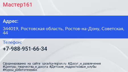 Мастер161 по адресу 344019, Ростовская область, Ростов-на-Дону, Советская, 44 в дальнейшем Организация, размещена в следующих категориях: