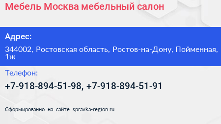Мебель Москва, мебельный салон по адресу 344002, Ростовская область, Ростов-на-Дону, Пойменная, 1ж в дальнейшем Организация, размещена в следующих категориях: