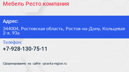 Мебель-Ресто, компания по адресу 344004, Ростовская область, Ростов-на-Дону, Кольцевая 2-я, 93а в дальнейшем Организация, размещена в следующих категориях: