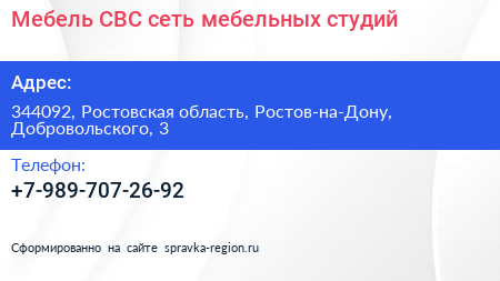 Мебель-СВС, сеть мебельных студий по адресу 344092, Ростовская область, Ростов-на-Дону, Добровольского, 3 в дальнейшем Организация, размещена в следующих категориях: