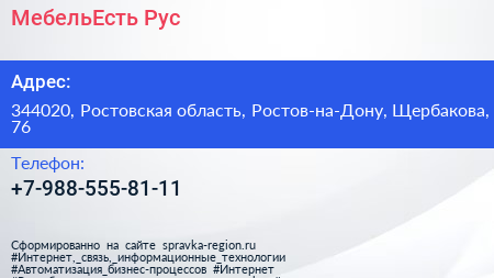 МебельЕсть.Рус по адресу 344020, Ростовская область, Ростов-на-Дону, Щербакова, 76 в дальнейшем Организация, размещена в следующих категориях: