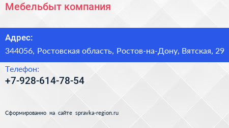 Мебельбыт, компания по адресу 344056, Ростовская область, Ростов-на-Дону, Вятская, 29 в дальнейшем Организация, размещена в следующих категориях: