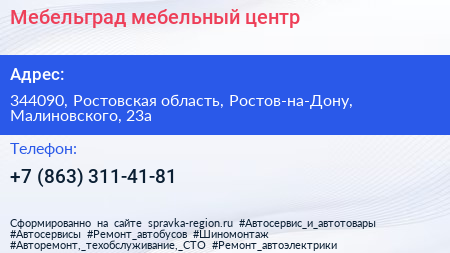 Мебельград, мебельный центр по адресу 344090, Ростовская область, Ростов-на-Дону, Малиновского, 23а в дальнейшем Организация, размещена в следующих категориях: