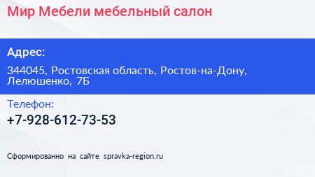Мир Мебели, мебельный салон по адресу 344045, Ростовская область, Ростов-на-Дону, Лелюшенко, 7Б в дальнейшем Организация, размещена в следующих категориях: