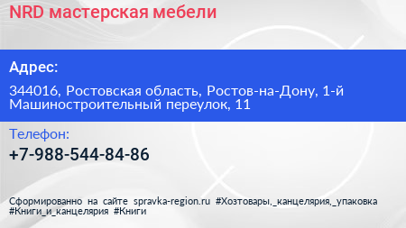 NRD, мастерская мебели по адресу 344016, Ростовская область, Ростов-на-Дону, 1-й Машиностроительный переулок, 11 в дальнейшем Организация, размещена в следующих категориях: