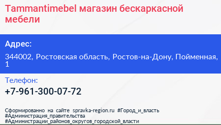 Tammantimebel, магазин бескаркасной мебели по адресу 344002, Ростовская область, Ростов-на-Дону, Пойменная, 1 в дальнейшем Организация, размещена в следующих категориях: