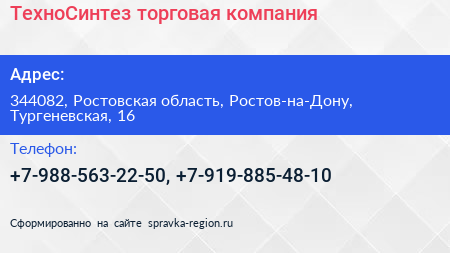 ТехноСинтез, торговая компания по адресу 344082, Ростовская область, Ростов-на-Дону, Тургеневская, 16 в дальнейшем Организация, размещена в следующих категориях:
