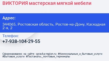 ВИКТОРИЯ, мастерская мягкой мебели по адресу 344065, Ростовская область, Ростов-на-Дону, Каскадная 2-я, 2 в дальнейшем Организация, размещена в следующих категориях: