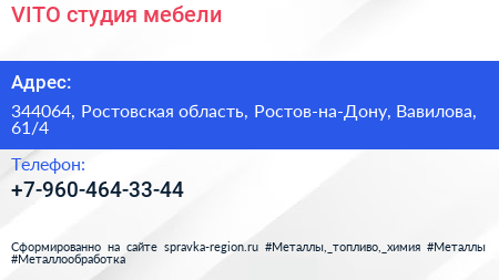VITO, студия мебели по адресу 344064, Ростовская область, Ростов-на-Дону, Вавилова, 61/4 в дальнейшем Организация, размещена в следующих категориях: