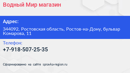 Водный Мир, магазин по адресу 344092, Ростовская область, Ростов-на-Дону, бульвар Комарова, 11 в дальнейшем Организация, размещена в следующих категориях: