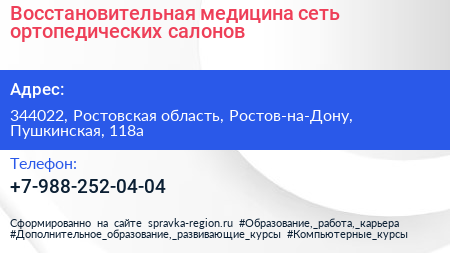 Восстановительная медицина, сеть ортопедических салонов по адресу 344022, Ростовская область, Ростов-на-Дону, Пушкинская, 118а в дальнейшем Организация, размещена в следующих категориях: