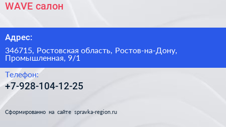 WAVE, салон по адресу 346715, Ростовская область, Ростов-на-Дону, Промышленная, 9/1 в дальнейшем Организация, размещена в следующих категориях: