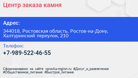 Центр заказа камня по адресу 344018, Ростовская область, Ростов-на-Дону, Халтуринский переулок, 210 в дальнейшем Организация, размещена в следующих категориях: