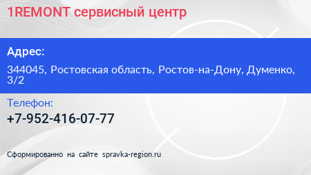 1REMONT, сервисный центр по адресу 344045, Ростовская область, Ростов-на-Дону, Думенко, 3/2 в дальнейшем Организация, размещена в следующих категориях: