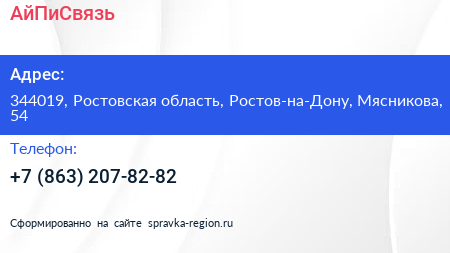 АйПиСвязь по адресу 344019, Ростовская область, Ростов-на-Дону, Мясникова, 54 в дальнейшем Организация, размещена в следующих категориях: