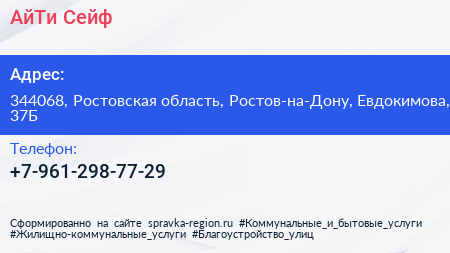 АйТи Сейф по адресу 344068, Ростовская область, Ростов-на-Дону, Евдокимова, 37Б в дальнейшем Организация, размещена в следующих категориях:
