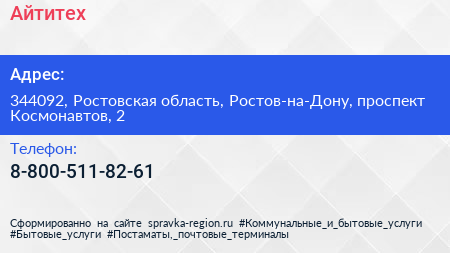 Айтитех по адресу 344092, Ростовская область, Ростов-на-Дону, проспект Космонавтов, 2 в дальнейшем Организация, размещена в следующих категориях: