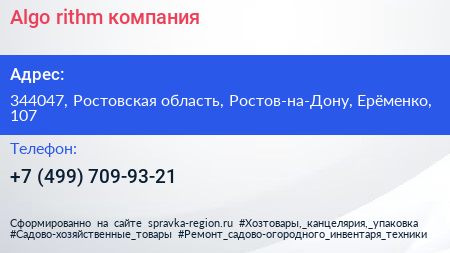 Algo-rithm, компания по адресу 344047, Ростовская область, Ростов-на-Дону, Ерёменко, 107 в дальнейшем Организация, размещена в следующих категориях: