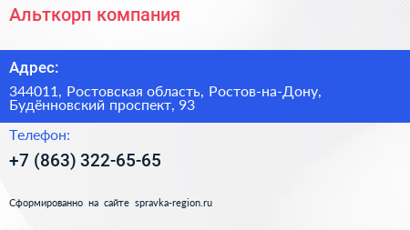 Альткорп, компания по адресу 344011, Ростовская область, Ростов-на-Дону, Будённовский проспект, 93 в дальнейшем Организация, размещена в следующих категориях: