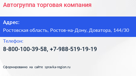Автогруппа, торговая компания по адресу Ростовская область, Ростов-на-Дону, Доватора, 144/30 в дальнейшем Организация, размещена в следующих категориях: