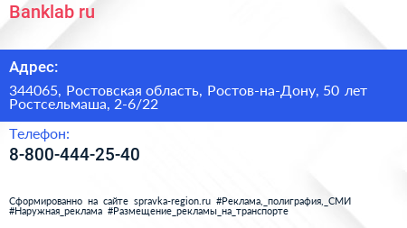 Banklab.ru по адресу 344065, Ростовская область, Ростов-на-Дону, 50 лет Ростсельмаша, 2-6/22 в дальнейшем Организация, размещена в следующих категориях: