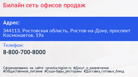 Билайн, сеть офисов продаж по адресу 344113, Ростовская область, Ростов-на-Дону, проспект Космонавтов, 19а в дальнейшем Организация, размещена в следующих категориях: