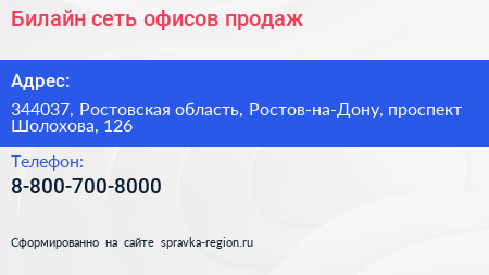 Билайн, сеть офисов продаж по адресу 344037, Ростовская область, Ростов-на-Дону, проспект Шолохова, 126 в дальнейшем Организация, размещена в следующих категориях: