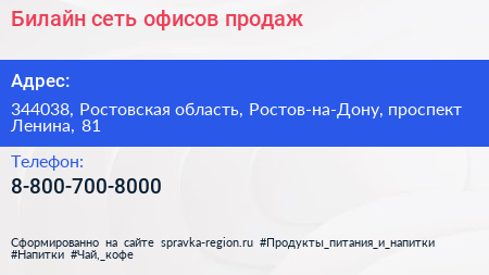 Билайн, сеть офисов продаж по адресу 344038, Ростовская область, Ростов-на-Дону, проспект Ленина, 81 в дальнейшем Организация, размещена в следующих категориях: