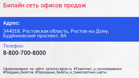Билайн, сеть офисов продаж по адресу 344018, Ростовская область, Ростов-на-Дону, Будённовский проспект, 84 в дальнейшем Организация, размещена в следующих категориях: