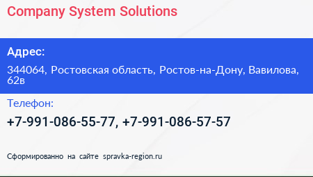 Company System Solutions по адресу 344064, Ростовская область, Ростов-на-Дону, Вавилова, 62в в дальнейшем Организация, размещена в следующих категориях:
