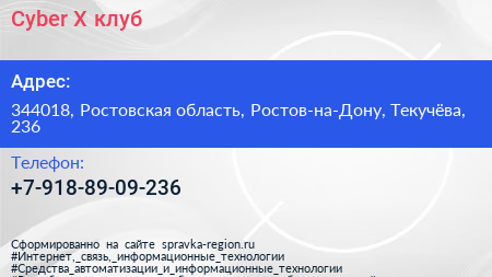Cyber:X, клуб по адресу 344018, Ростовская область, Ростов-на-Дону, Текучёва, 236 в дальнейшем Организация, размещена в следующих категориях: