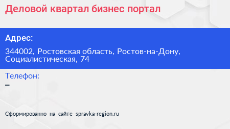 Деловой квартал, бизнес-портал по адресу 344002, Ростовская область, Ростов-на-Дону, Социалистическая, 74 в дальнейшем Организация, размещена в следующих категориях: