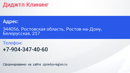 Диджтл Клининг по адресу 344056, Ростовская область, Ростов-на-Дону, Белорусская, 217 в дальнейшем Организация, размещена в следующих категориях: