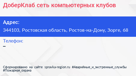 ДоберКлаб, сеть компьютерных клубов по адресу 344103, Ростовская область, Ростов-на-Дону, Зорге, 68 в дальнейшем Организация, размещена в следующих категориях:
