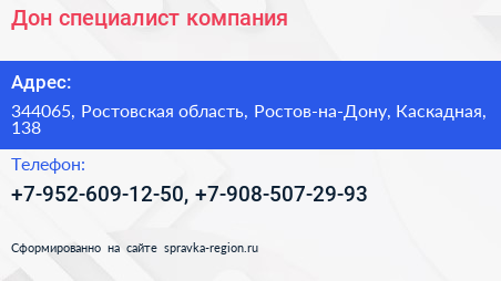 Дон специалист, компания по адресу 344065, Ростовская область, Ростов-на-Дону, Каскадная, 138 в дальнейшем Организация, размещена в следующих категориях: