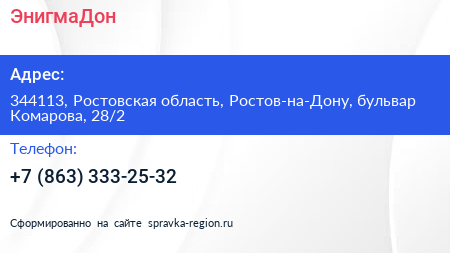 ЭнигмаДон по адресу 344113, Ростовская область, Ростов-на-Дону, бульвар Комарова, 28/2 в дальнейшем Организация, размещена в следующих категориях: