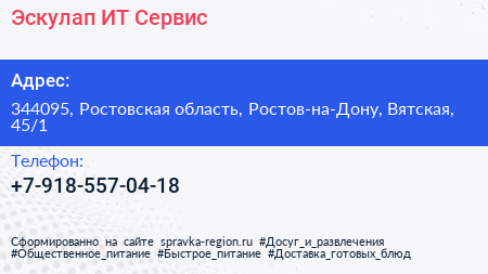 Эскулап ИТ-Сервис по адресу 344095, Ростовская область, Ростов-на-Дону, Вятская, 45/1 в дальнейшем Организация, размещена в следующих категориях: