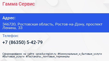 Гамма-Сервис по адресу 346720, Ростовская область, Ростов-на-Дону, проспект Ленина, 33 в дальнейшем Организация, размещена в следующих категориях: