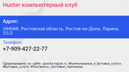 Hunter, компьютерный клуб по адресу 344068, Ростовская область, Ростов-на-Дону, Ларина, 15/2 в дальнейшем Организация, размещена в следующих категориях: